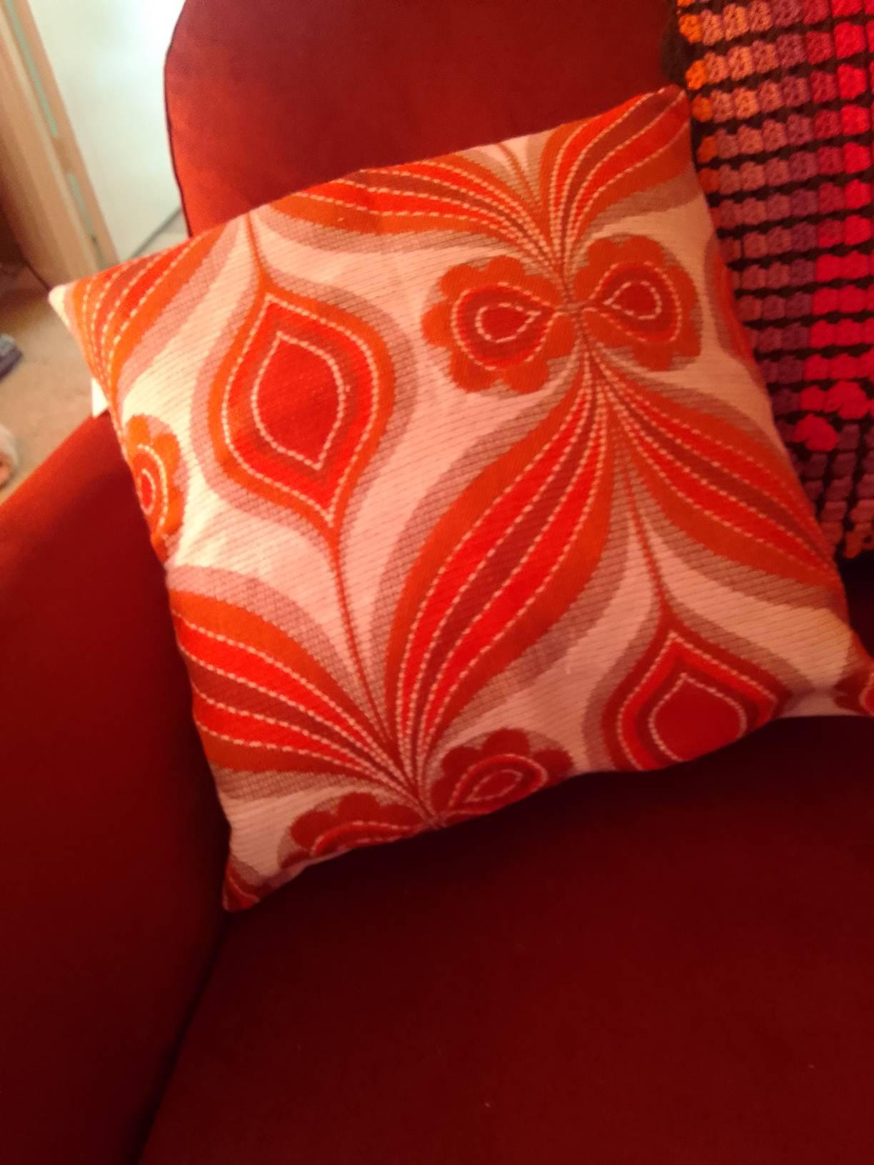 Beautiful hand made cushion cover from original 1970s shades of autumn red large bold geometric pattern fabric, this would make a gorgeous statement piece to any retro or modern living space or mix and match with own of our other stunning covers from our extensive range